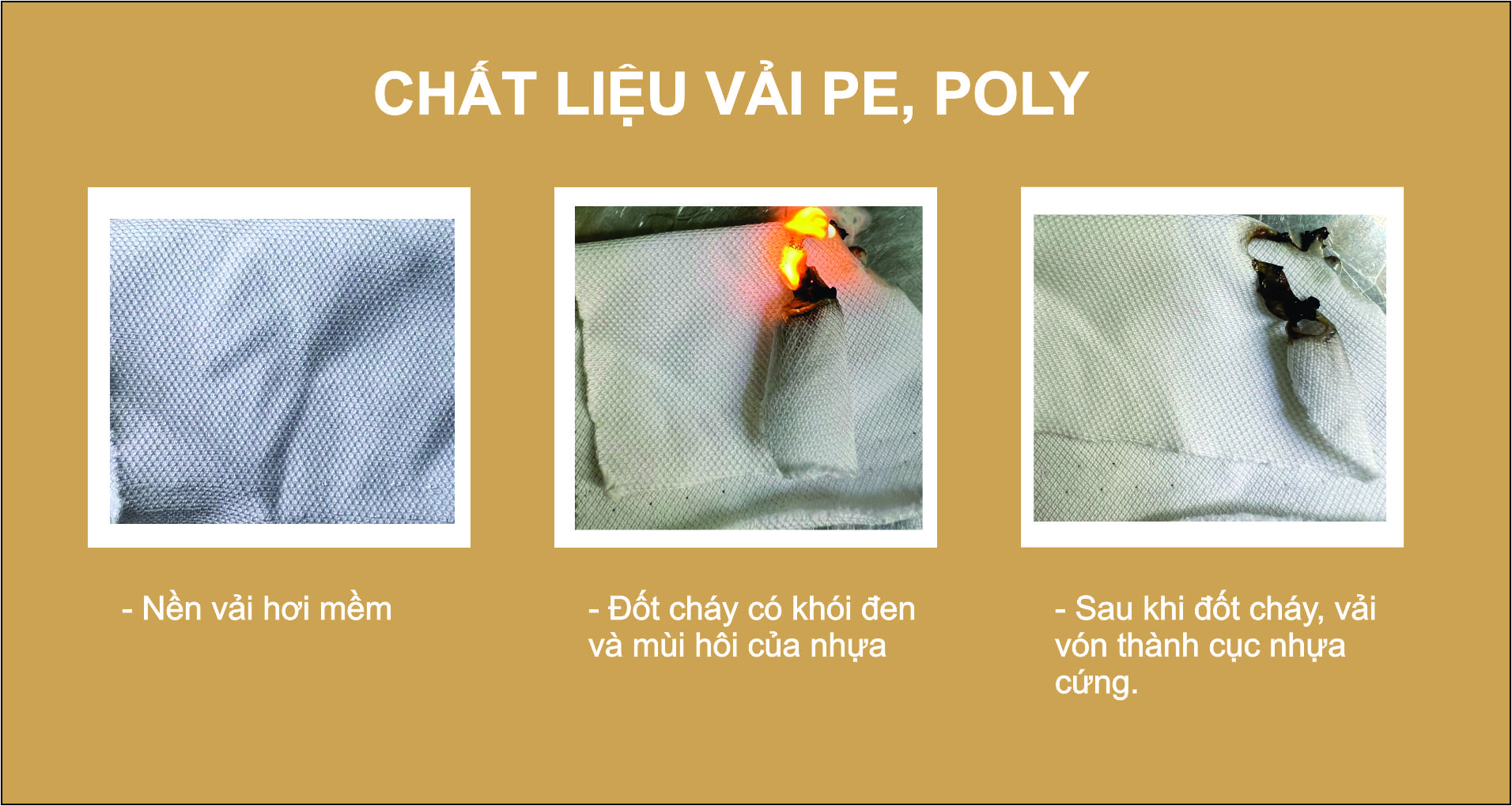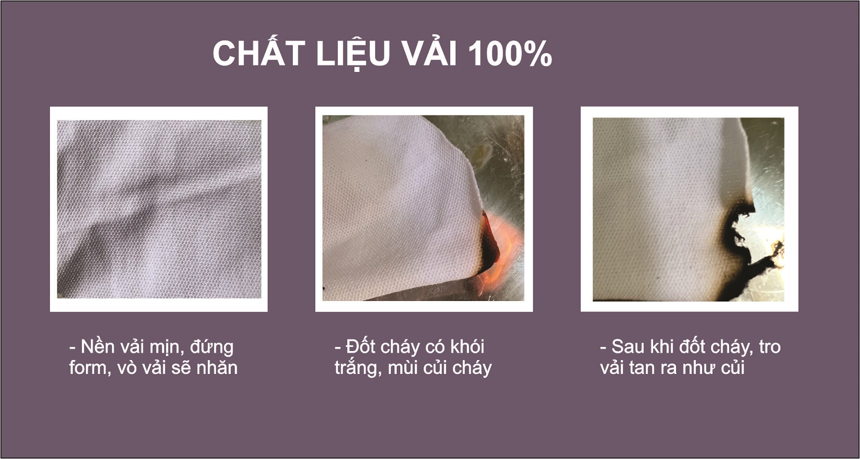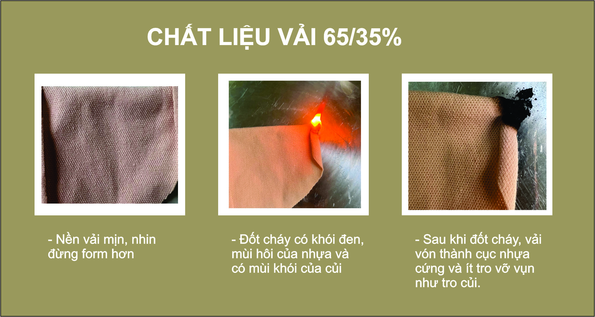 Tuy nhiên khách hàng là những anh/chị không làm trong ngành may mặc sẽ khó phân biệt được. Vì vậy đồng phục Khala.vn sẽ hướng dẫn anh/chị tự kiểm tra chât liệu vải bằng phương pháp đốt cháy vải.